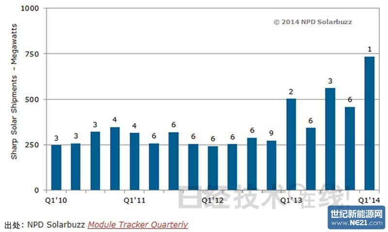 2014年一季度,夏普的太阳能电池模块出货量时隔五年重返全球第一宝座,这是NPD Group的太阳能电池部门Solarbuzz在该公司的季度组件跟踪报告“Module Tracker Quarterly”中公布的。