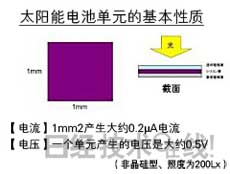 手表用太阳能电池单元采用的是非晶硅式(图4)。一个单元产生的电压为大约0.5V,为手表内的二次电池充电大约需要3V的电源,因此必须串联6个单元(图5),形状就像切成6块的披萨。这时,从6个单元流过的电流值跟产生电流最小的单元相同(图6)。这个电流值最小的单元就是针影面积较大的单元。