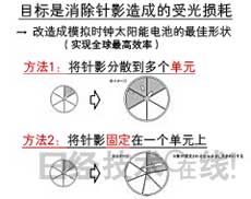卡西欧设法消除了针影造成的受光损失。采用的方法主要有两种(图7),一是将针影分散到多个单元,通过平均受光损失来尽量增加发电量。