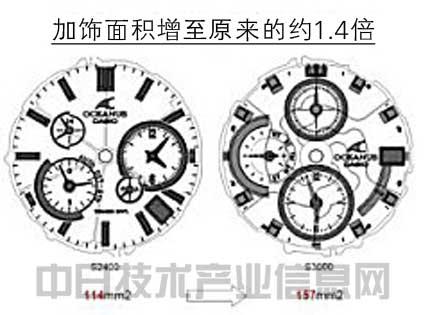 通过采用这种漩涡形状,新产品的指针面积增至原来的约1.3倍,表盘加饰面积增至原来的约1.4倍(图12、13)