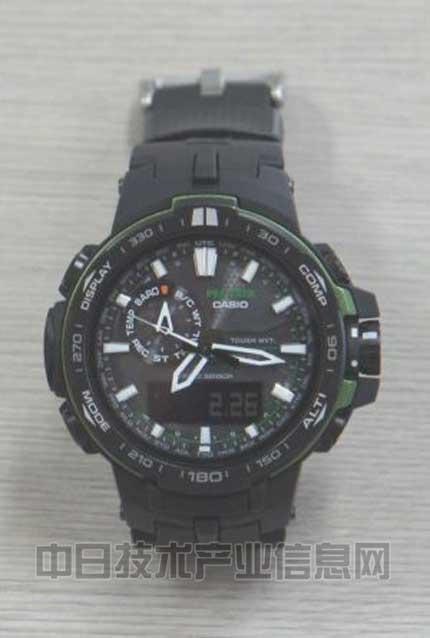 之后,卡西欧计算机又在户外用手表上配备了新型的太阳能电池单元,那就是2014年3月上市的“PRO TREK”系列的新产品“PRW-6000Y”(图14)。PRO TREK是面向户外运动爱好者的手表,具有感应方位、气压、高度和温度的功能。据卡西欧计算机介绍,很多登山爱好者看表时只是瞥一眼,通过长针和短针的角度来瞬间掌握时间,因此对指针式手表有很高的需求。