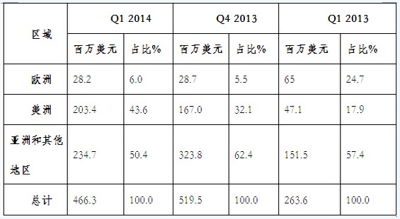 10、第一季度,阿特斯全球各区域市场占公司总销售额比重分别为:欧洲6%,美洲43.6%,亚洲和其他地区50.4%(下表):