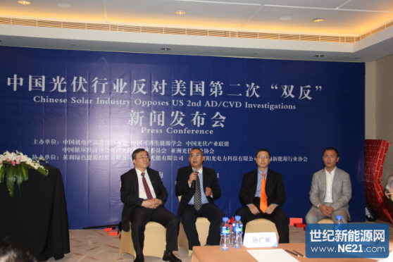世纪新能源网记者孙文艳上海报道:21日下午,为反对美国第二次对华光伏“双反”,阐明中国光伏行业的立场,由中国机电产品进出口商会、中国可再生能源学会、中国光伏产业联盟、中国循环经济协会可再生能源专业委员会、亚洲光伏产业协会主办,英利、天合、阿特斯、上海新能源行业协会承办的