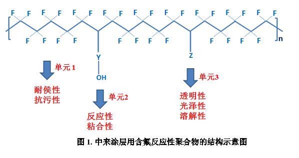 要得到一款性能优异的背板,合理的设计是至关重要的。在我们的设计中,PET ─ 一种在食品包装工业中广泛应用的材料被用作基材: 因为其良好的机械性能和低成本使其作为组件封装材料而具有强大的吸引力。然而,未经涂层(未修饰)的PET水气透过性很高。在实际应用中容易产生各种降解,例如水解和热氧化,这将导致PET的各种性能变差。因此,PET不能直接作为背板使用,而必须进行涂层或表面修饰。含氟聚合物已被证明具备多个作为涂层所必须拥有的性质,比如优良的疏水性和疏油性(耐污染性)、低摩擦系数、优异的耐化学品性和良好的耐候性。传统的含氟聚合物涂料,如聚四氟乙烯(PTFE)和聚偏二氟乙烯(PVDF),除了其高成本外,还因为其化学惰性,不溶于大部分有机溶剂而使加工处理变得很困难。经过广泛筛选,一种含氟反应性聚合物被选做涂料的主体材料来制造新型的膜胶一体化背板。图1给出了含氟反应性聚合物的化学结构示意图。