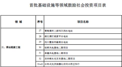 分布式光伏规模化应用示范区30个、龙羊峡水光互补基地二期项目等项目进入首批国家基础设施等领域社会投资项目。据悉,经国务院同意,为加快投融资体制改革,推进投资主体多元化,进一步发挥社会资本作用,决定在基础设施等领域首批推出80个鼓励社会资本参与建设营运的示范项目。