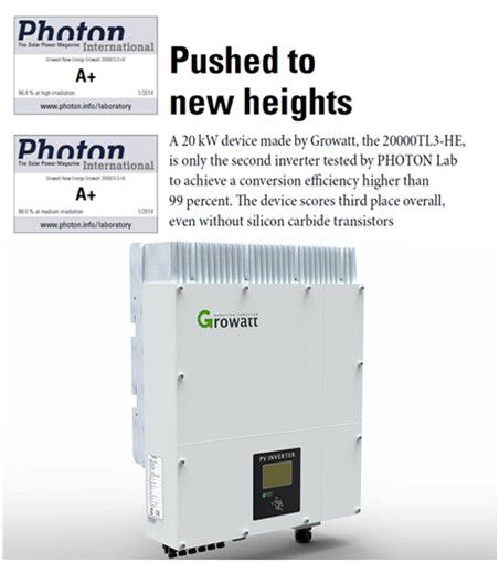 在PHOTON杂志的推荐中,毫不掩饰对Growatt 20000TL3-HE的赞美之词。“这是一款没有内置变压器的三相逆变器,经测试最高效率达到了99.02%,是PHOTON实验室成立以来仅有的两款测试效率超99%的机器之一”。PHOTON实验室测试经理Anne Kreutzmann表示,“从整体表现来看,如果真要在SMA和Growatt选择一个的话,我真的无法断定哪个最好”。 目前该机型已在国内个别电站中进行了应用,发电效果非常好,专家预期,该款机型在未来的分布式电站市场中将会大放异彩。