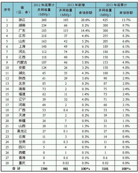刚刚拿到国家能源局发布的2013年光伏发电统计数据。其中分布式光伏电站项目主要分布在电力负荷比较集中的中东部地区,华东和华北地区累计并网容量分别为145万和49万千瓦,占全国分布式光伏的60%。排名前三的省份分别为浙江、广东和河北省,并网容量分别达到16万千瓦、11万千瓦和7万千瓦,三省之和占全国分布式光伏并网总容量的40%以上。