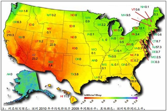 2000年至2008年美国的新增容量中,80%以上位于加州市场。美国各州的光照条件和零售电价不同,因此安装光伏系统的经济性也各异,而加州拥有很好的光照资源,同时人口集中,能耗集中,零售电价也较高,发展太阳能的潜力显著。