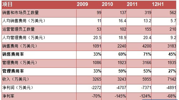 公司在销售和管理的投入也非常大,销售费用率和管理费用率非常高,2011年分别高达71%和53%,2012年上半年仍然高达45%和27%。由此可见公司对销售渠道的高度重视。