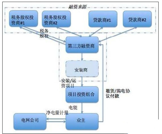 在光伏发电系统第三方融资模型的实际应用中,SolarCity和Sunrun是现在美国典型的第三方融资商。银行和投资商(如摩根斯坦利)做SolarCity公司的税收股权投资商。