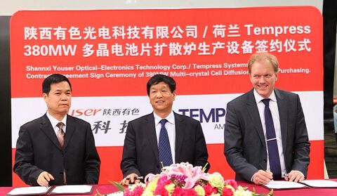 索比光伏网讯:5月20日,陕西有色光电科技有限公司/荷兰Tempress Systems B.V.于上海新国际博览中心TempressSystemsB.V.展台签署签订380MW多晶电池片扩散炉生产设备采购合同。陕西有色光电科技有限公司总经理范江峰先生、中国有色金属进出口陕西公司贺广民先生、TempressSystemsB.V.公司总经理AlbertHasper先生与以及来自光伏行业和媒体的多位嘉宾出席了此次签约仪式,共同见证了这一激动人心的时刻。