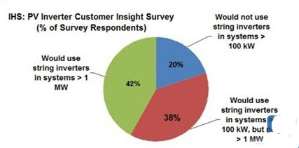 IHS的一个重要发现是,对于规模超过1MW的大型光伏发电站,认为组串式逆变器的接受程度越来越高。根据IHS调查,40%的逆变器买家目前考虑组串式逆变器而非集中型逆变器,由于他们可以提供更好的灵活性,并减少电力损失。