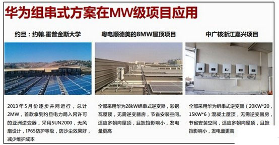 一期8.9MW浙江龙腾科技发展有限公司项目于2014年2月下旬开工建设,4月30日建成并网。项目利用龙腾公司7个厂房共计12万平方米的屋顶,安装250W多晶硅组件35720块。华为为该项目提供SUN2000组串光伏逆变器总计409台。该产品最高效率达98.7%,3路MPPT,6路组串智能监控,采用自然散热、无风扇设计及业界最高防雷等级,消除直流安全隐患。