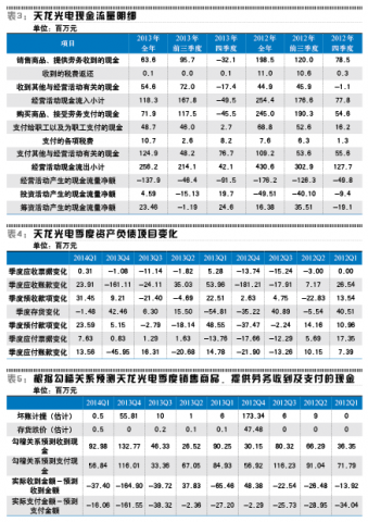 更有意思的是,2013年的现金流量表中,天龙光电全年销售商品、提供劳务收到的现金为6360万元,而前三个季度累计有9570万元之多,可推算四季度的金额为-3210万元。根据公司的说法,冲减1.15亿元部分客户的已确认收入是因为其货款支付比例较低,这意味着应该冲减其应收账款,而不应影响公司已收到的现金流。表2中销售商品、提供劳务收到的现金为负数意味着有大量现金流入在四季度被冲减,暗示之前冲减的收入最起码部分是有现金流入的虚假销售收入,而并不全是应收账款。