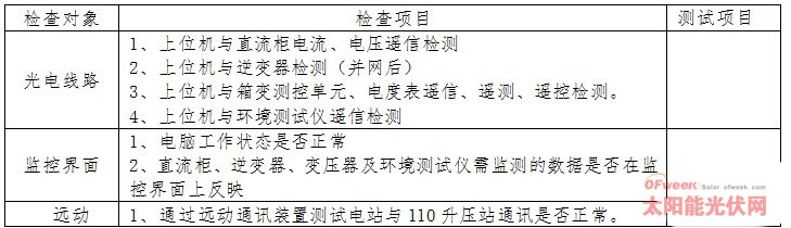 通过监控上位机“启动/停止”按钮,检查逆变器远方开关机功能;检测监控“启动/停止”逆变器后,逆变器能否自动“停止/启动”;检查监控系统的控制流程。