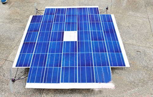 所谓“飞机”,其实是一个四四方方的飞行平台,名叫全太阳能垂直起降飞行卫星平台,由南昌航空大学的4名大学生们共同研制完成。记者看到,飞行平台高度约50厘米,在1.5平方米的平台上搭载了44块太阳能电池板,为4个旋翼提供动力。制作团队负责人,南昌航空大学飞行器工程学院大三学生戴维告诉记者,这个飞行平台最大的亮点就是轻,全机没有一块金属,整体重量只有300克。