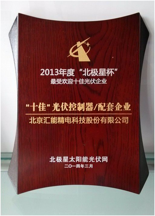 索比光伏网讯: 历时半个月的2013年度“北极星杯”最受欢迎十佳光伏企业评选活动于2013年12月31日落下帷幕,本次投票活动得到众多网民积极响应,在整个光伏圈里掀起了一阵投票热潮。在紧张而又激烈的角逐中,北京汇能精电科技股份有限公司作为太阳能控制器、逆变器制造商,在控制器/配套企业类别中以2824票的好成绩再度荣获最受欢迎“十佳光伏企业”荣誉称号。