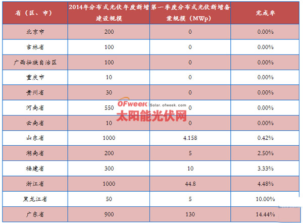山东作为分布式光伏发展大省,2014年第一季度新增分布式备案容量仅0.415万千瓦,约占年度规模的0.42%。此外,浙江省2014年度分布式光伏建设指导规模为100万千瓦,而第一季度仅新增备案4.48万千瓦;广东第一季度分布式光伏建设情况较好,但新增备案容量也仅有13万千瓦。