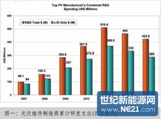主要晶硅组件制造商的研发支出在2011年达到最高峰3.69亿美元,但现在已回落至2010年的水平上。在为期两年的低迷期内,支出水平稳步下调,证实了许多企业都将研发支出当成可任意调整的因素,并因应业务状况变化而非战略因素对其进行调整,因此这也对未来产业的繁荣起到了至关重要的作用。