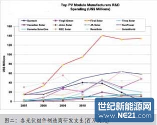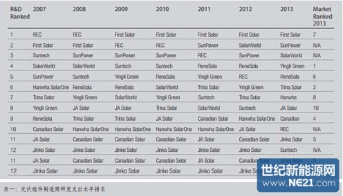 SunPower、REC太阳能和SolarWorld等其他公司在研发支出排名一直位居前列,但在2013年却没有一个跻身至NPDSolarbuzz公布的前十位组件供应商榜单中。