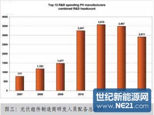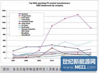 有五家公司(天合光能、晶科能源,韩华新能源、昱辉阳光及SolarWorld)在2012年减少了他们的研发部门员工数量。这种趋势一直持续到2013年,仍旧是五家公司(英利绿色能源、阿特斯太阳能、晶科能源、韩华新能源和昱辉阳光)减少了研发部门员工数量。