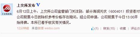 索比光伏网讯:今日午间,新浪微博官方认证的“上交所发布”称今日上午,上交所公司监管部门关注到,部分海润光伏投资者对公司股票今日的除权参考价格存在疑问。经公司申请,公司股票于今日13:00开始停牌。本所已着手核实有关情况。