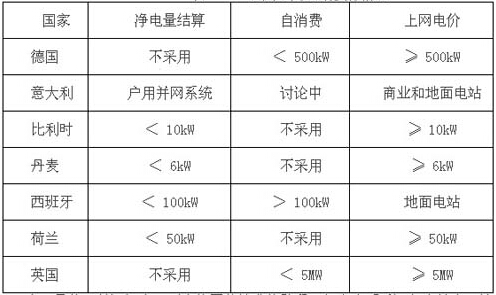 欧洲各国执行“上网电价”、“净电量计量”和“自消费”政策的情况归纳如下: