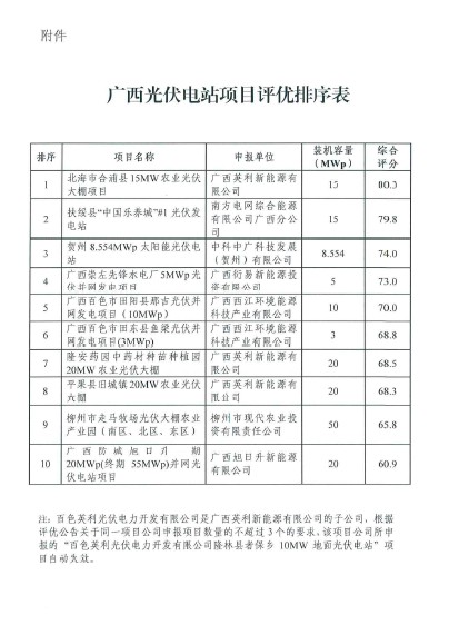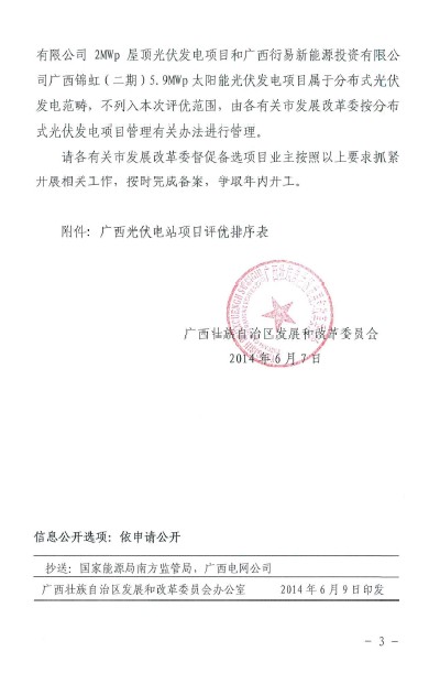 结果显现,英利新能源、南方电网等五家公司申报的项目综合排名前五位,将作为广西2014年度光伏电站备选项目,项目总规模约50MW。目前,广西发改委已经下发《广西壮族自治区发展和改革委员会关于公布我区2014年光伏电站项目评优结果的通知》(桂发改能源〔2014〕679号),请各有关单位根据通知要求开展相关工作。