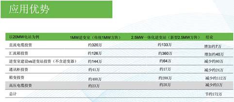 以20MW电站建设成本为例,应用2.5MW光伏水冷型一体化逆变站可节约成本约172万。
