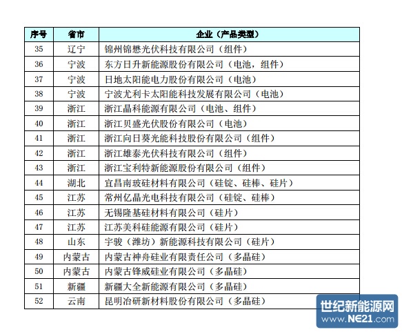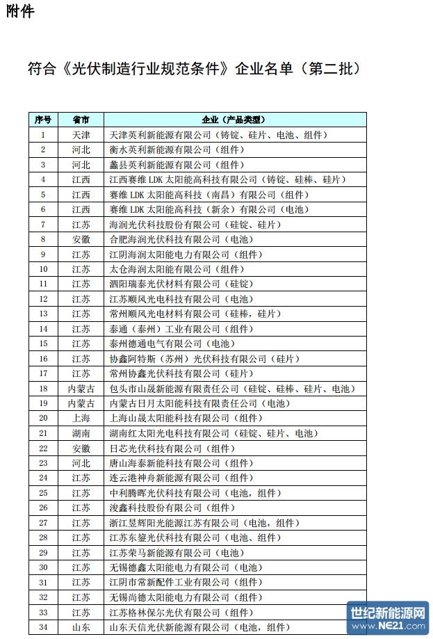 按照《国务院关于促进光伏产业健康发展的若干意见》的要求,根据《光伏制造行业规范条件》及《光伏制造行业规范公告管理暂行办法》,经企业申报、省级工业和信息化主管部门核实推荐、专家复核、网上公示及现场抽检,现将符合《光伏制造行业规范条件》企业名单(第二批)予以公告。