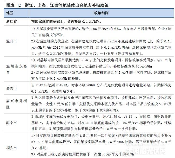 从上表可以看出,分布式光伏配额集中于东部沿海城市,山东、江苏、浙江、广东、河北均超过60MW。各地区为了促进分布式光伏的发展,在国家补贴的基础上纷纷提出了不同的地方补贴。