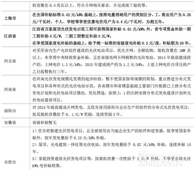 地方政府对分布式的支持主要表现在提供补贴电价上,提高项目的收益率,有些进行了一定的初始安装补贴,有利于提高项目现金流回收速度。
