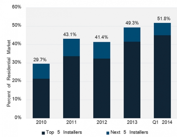 十大安装商目前占美国住宅太阳能市场的一半以上。
