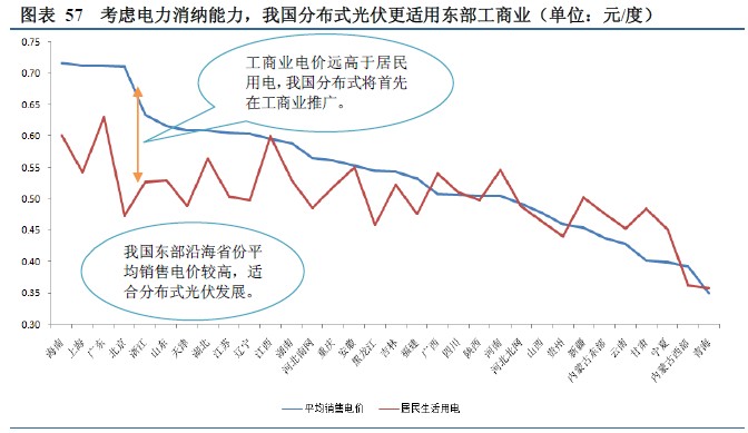 我国工商业电价远高于居民用电,且工商业用电仍占据社会总用电较高的比例,其中高耗能企业也成为大气污染的主要元凶,在现阶段光伏度电成本为0.7~0.8元以上的情况下,分布式光伏更适宜在工商业领域推广。