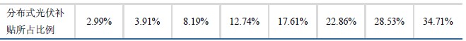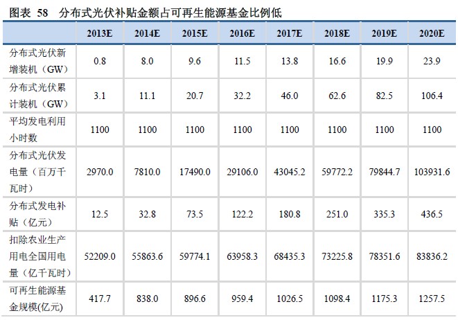 在分布式光伏度电成本未达到工商业用电电价之前,分布式的发展仍然依赖国家补贴,国家的度电补贴0.42元来源于可再生能源基金,根据可再生能源发展基金征收使用管理暂行办法,我们假设社会用电量增速为7%、分布式光伏新增装机当年发电为半年时间、发电利用小时数为1100小时,对未来的可再生能源基金以及分布式光伏补贴金额进行了预测。