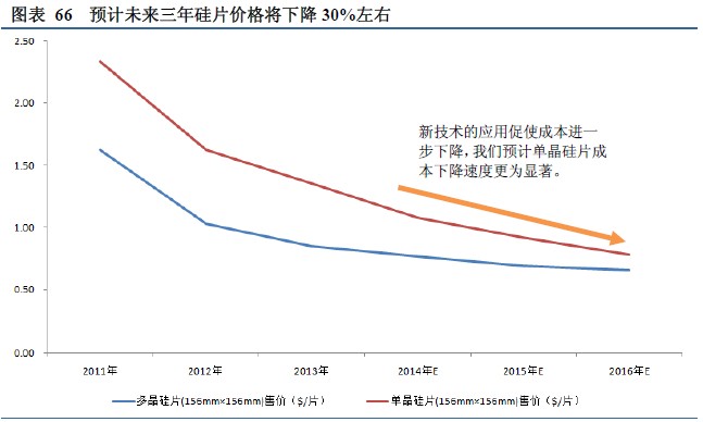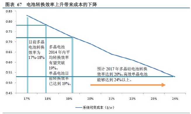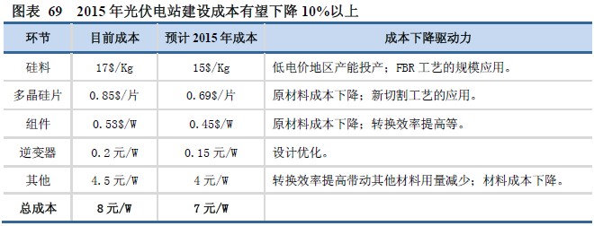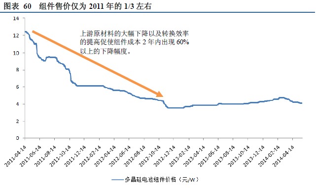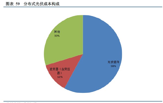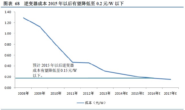 我们认为未来组件和逆变器两部分将是分布式光伏电站主要的成本下降领域。组件环节通过转换效率不断提高以及工艺改进促进材料使用成本不断下降,成本下降至2011年的1/3左右,我们认为未来3年内仍有20%~30%的下降空间。