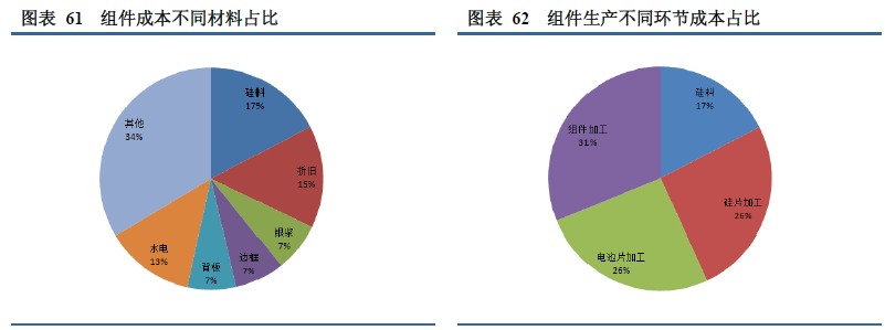 我们对组件成本进行拆分,随着多晶硅料价格不断下降以及单位用料的不断减少,多晶硅成本占组件成本比例只有15%~17%,其余占成本比例比较大的材料有银浆、边框等。在组件生产环节中,我们认为未来硅片、电池片加工环节效率有望不断提高、成本持续下降,电池片转换效率的提高也将促进组件加工成本不断下降。
