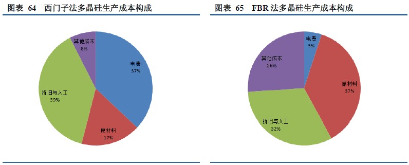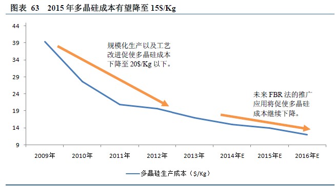 目前我国三大多晶硅厂商均有扩产计划,大全新能源规划2014年年底将现有6千吨产能扩张至1.2万吨,受益于工艺改进以及新疆电价较低,2015年达产后成本有望降至12$/Kg。同样地处新疆的特变电工1.2万吨新线已经达产,预计成本已下降至13$/Kg以下。2015~2016年多晶硅价格大幅下跌依赖于硅烷流化床(FBR)工艺的应用,FBR法成本中电费成本下降至9%左右,而西门子法电费占成本比例40%左右,因此极大地降低了多晶硅生产成本。SunEdison使用FBR生产多晶硅已超过20年,然而规模只有4200吨,并不具备规模效应。REC在2010年以后拥有1.6万吨生产能力,是使用FBR生产多晶硅最大规模的产能,现金成本已从13年年初14$/Kg下降至10.5$/Kg。GCL的2.5万吨FBR生产线将于2015年投产,成本有望降至10$/Kg以下,我们预计全球FBR生产线产能占比将从8%提高至15%以上,届时多晶硅料价格将出现新一轮下降。