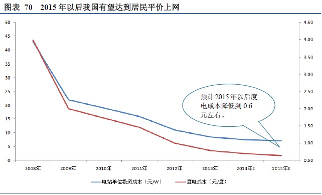 根据上述测算,我们认为2015年以后分布式光伏电站度电成本有望降低到0.6元左右,而火电由于环保问题,其外部性成本日益增高,2015年后我国光伏有望进入居民平价上网阶段,工商业用户在没有补贴的条件下仍可获得6%~8%的内部回报率,可以逐步摆脱对补贴的依赖,分布式光伏市场将真正爆发成长性。