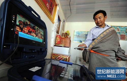 6月17日,青海省海西蒙古族藏族自治州都兰县果米村的藏族牧民在家中收看电视节目。