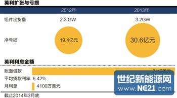英利在2013年的组件出货量同比增长40%达到3.2GW,在全球的市场份额由2012年的7.4%升至2013年的10%,连续第二年蝉联出货量全球第一。这种激进的扩张使得英利从2011年三季度开始就持续亏损,2012年和2013年净亏损分别为30.6亿元人民币和19.4亿元人民币。