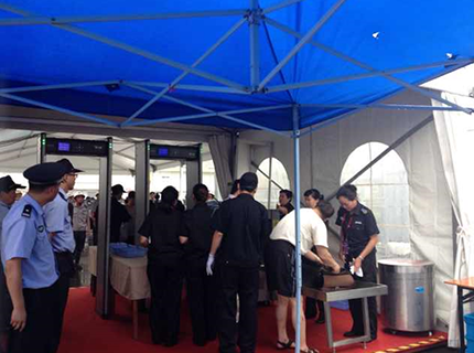 在超日太阳总部的三号门外,门口已有四、五十位保安及警察维持秩序。现场还摆放有蛇形通道直达安检处,李明(化名)携带的长柄雨伞被安检人员要求寄存,瓶装水也不允许带入会场。
