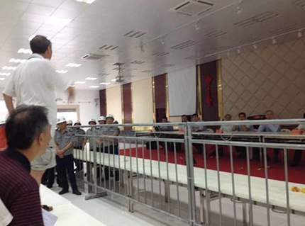 昨日的债券持有人会议被安排在厂区的一处食堂内召开,两点的会议开始前,共计有约50位投资者到会。赴会的投资者年龄多在50岁上下,持有数十万甚至百万元不等的“11超日债”。记者注意到,会场内的保安数量甚至超过了参会者,而现场还竖起了一排一米多高的铁栅栏,将主席台与台下的债券持有人隔离。