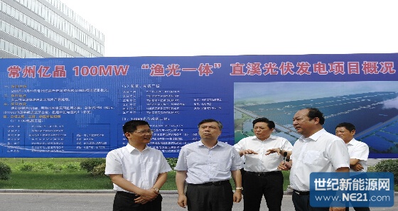 据悉,在亿晶光电西厂区100MW“渔光一体”发展项目展示牌前,亿晶光电董事长荀建华向领导们详细介绍了项目情况和工程建设进度。“亿晶光电在2013年11月20日就取得了该项目的批文,利用金坛市直溪镇建昌北天荒水产养殖场,项目建设规模为100MW,用地1980亩宽阔鱼塘水面,总投资约8.6亿元,以110千伏电压等级送至茅山变,投递年发电量约1.1亿度,100MW光伏系统工程工期是从2014年6月---2014年11月。在实施工程中我们虽然遇到很多的困难,但是最后都自己克服了。”