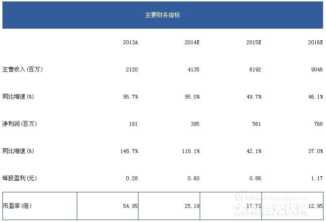 3.组件业务景气回升,出货量有望大幅增长。公司目前组件与电池片配套产能约800MW,公司2013年组件销售量约400MW,随着国内电站加速建设开发以及公司电站业务的快速增长,2014年组件业务有望达到满产满销,出货量同比出现大幅增长。