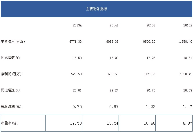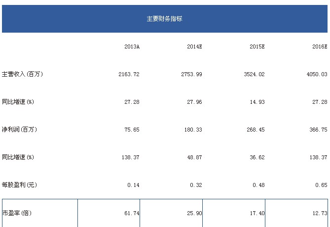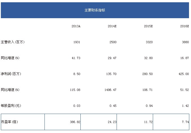 2.海缆市场龙头有望迎来高增长。海缆目前是蓝海市场,海上风能、海上石油等项目对海缆的需求不断上升。公司在海蓝市场为国内龙头,市占率高达60%。公司作为国内军工海光缆的唯一提供方,有望充分享受军工光缆这一蓝海市场。我们预计2014年下半年有望推出海上风电补贴政策,我国海上风电将迎来发展元年,公司的海缆产品独家中标龙源海上风电项目,海上电缆全国市占率约40%-50%市占率,充分受益于未来我国海上风电场的快速发展。