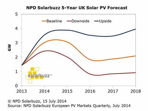 由于支持机制改变,2015年后的下降将到来——英国正在从其目前的可再生能源责任(RO)补贴计划切换到十月新的差价合约(CfD)。差价合约将看到在招标过程中竞争的所有能源来源由被称为征收控制框架(LCF)的中央控制预算服务。英国政府尚未透露对于各个竞争发电来源的资金分配。