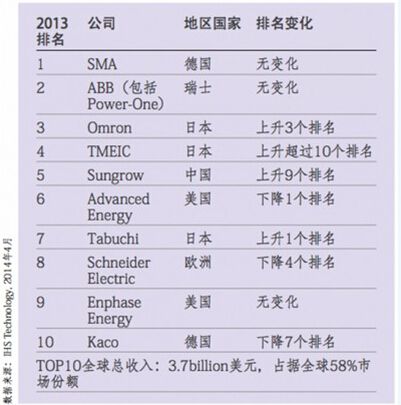 来自亚洲市场的光伏逆变器需求不断上升,使得该地区的本土供应商抢占了越来越多的全球市场份额。2013年,来自中国和日本的供应商共占全球光伏逆变器收益的35%,而2011年这一数字只有12%。由于亚洲地区市场对国际供应商来说都有着较高的贸易壁垒,所以这些本土的供应商们已经成功地控制了他们本地的市场,并一跃进入全球排名前十的位置。