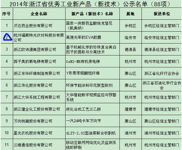 经过初审并组织专家进行评审,经核准评定,共有88个项目拟定为2014年浙江省优秀工业新产品(新技术),其中杭州福斯特光伏材料股份有限公司的高透光率的EVA胶膜顺利入围。