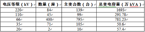 截止2011年底,220kV变电站84座,主变139台,总变电容量1693万kVA。110kV变电站45座,主变89台,总变电容量291.78万kVA。66kV变电站400座,主变795台,总变电容量781.23万kVA。35kV变电站71座,主变105台,总变电容量50.69万kVA。20kV变电站2座,主变10台,总变电容量57.4万kVA。